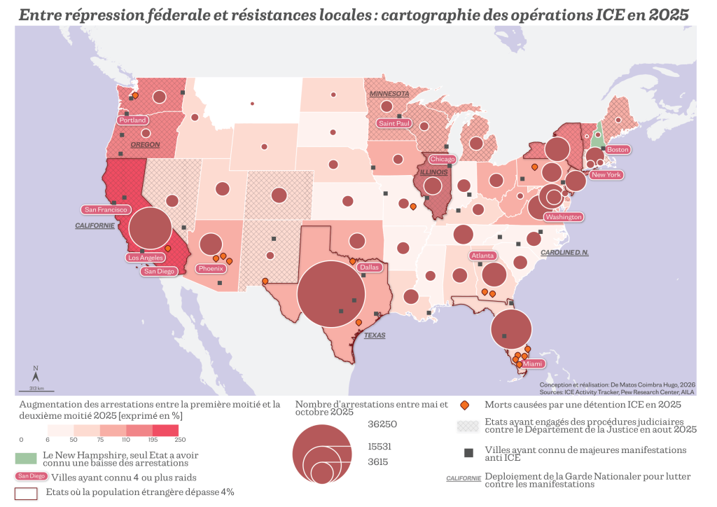 a deuxième présidence de Donald Trump entre en rupture avec les politiques migratoires mises en place par son prédécesseur. Après avoir fait de la lutte contre l’immigration un vecteur clé de sa campagne présidentielle, différentes mesures budgétaires et politiques ont été mises en œuvre pour rendre la « chasse aux immigré·es » plus effective. En 2026, le budget de l’ICE atteint 11,3 milliards de dollars, avec 20 000 postes, et le One Big Beautiful Bill Act (Loi du grand et beau projet) prévoit entre 120 et 170 milliards pour la période 2026-202910. Cette somme permettra de financer la construction de 50 nouveaux centres de détention. Le nombre d’arrestations a également explosé dans tous les États, à l’exception du New Hampshire. Si en 2024, 270 000 personnes ont été expulsées par l’ICE, le nombre d’expulsions est passé à 400 000 en 2025, selon le département de la Sécurité intérieure11. Certains États atteignent une hausse de 254 % des détentions entre la première moitié de l’année et la seconde. De même, on constate que les États qui connaissent la plus forte hausse des détentions ne sont pas forcément ceux qui possèdent le plus grand nombre de migrants, mais ceux qui possèdent des villes sanctuaires. Ainsi, la Floride, qui se place pourtant en troisième position en termes de nombre de migrants (4,6 millions, soit 10% de sa population), n’a connu une hausse des arrestations que de 56 %. En revanche, des États comme l’Oregon ou l’Illinois qui ne comptent qu’une part relativement faible de migrant·es – 0,9% pour le premier et 4% pour le deuxième – ont vu une explosion des arrestations : l’Illinois est ainsi passé de 957 arrestations pour la période janvier-mai 2025 à 2807 pour la période mi-octobre 2025 et l’Oregon est passé de 216 arrestations à 595 sur la même période12. Les deux sont considérés par le Département de Justice comme des États sanctuaires.
